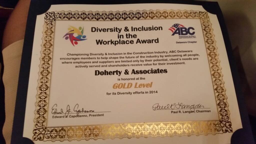 Doherty & Associates was awarded the Associated Builders and Contractors’ (ABC) “Diversity & Inclusion in the Workplace” Award at ABC’s Annual Dinner on November 20th, 2014. D & A was honored at the “Gold Level” as a company who embraces diversity on a variety of levels. ABC encourages members to help shape the future of the construction industry by welcoming all people, where employees and suppliers are limited only by their potential, client’s needs are actively served and shareholders receive value for their investment.